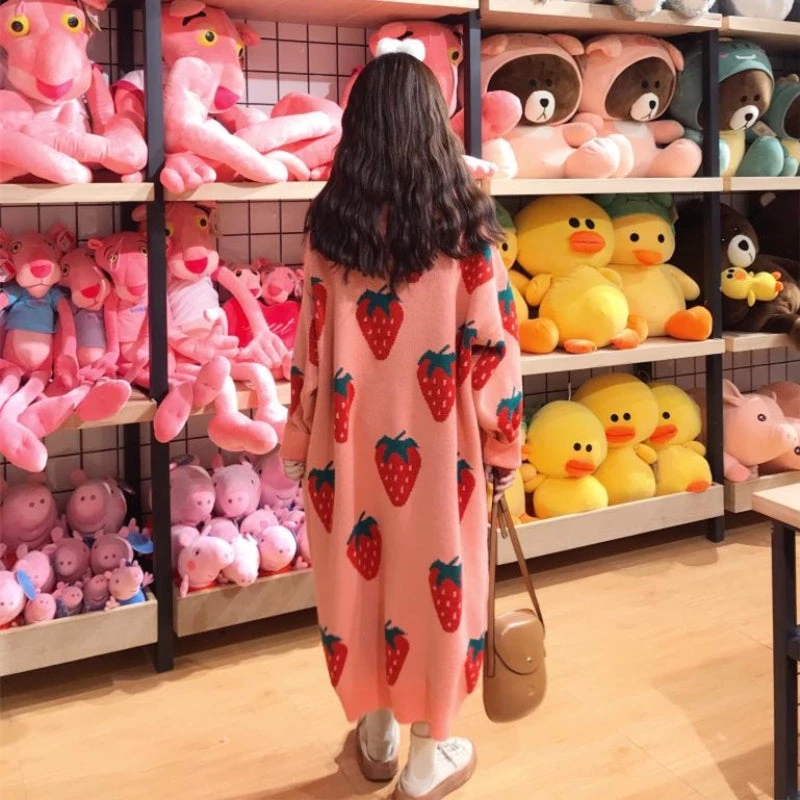 Cute Strawberry Loose Long Sweater Dress offers you a combined plush cozy comfort and adorable kawaii accented look. This cute kawaii loose sweater dress is playfully designed with large strawberries print- a dreamy wish come true to all those who love anything cute and “strawberry”.